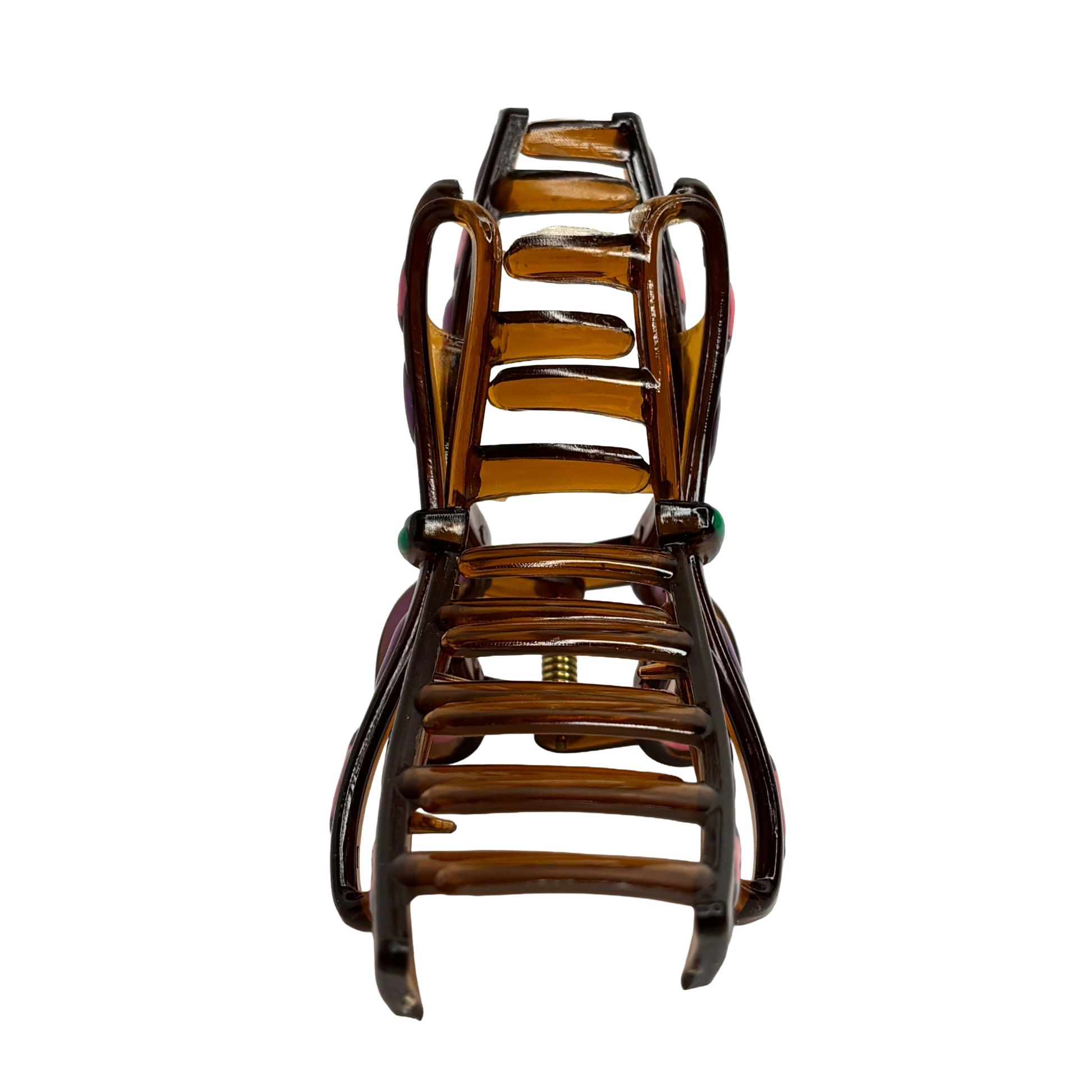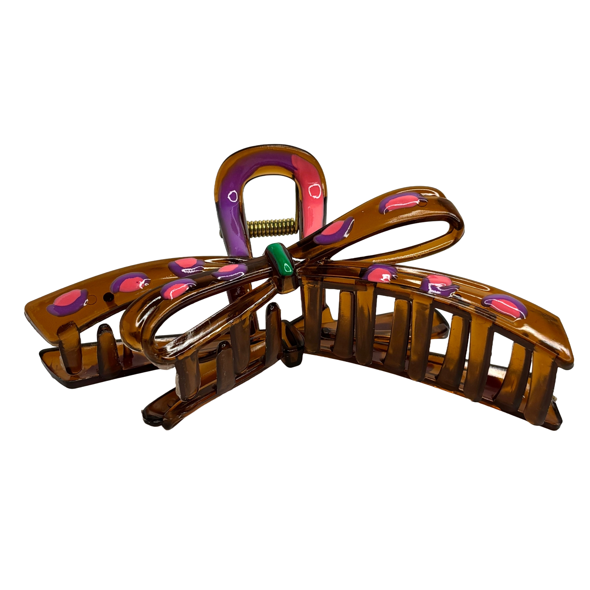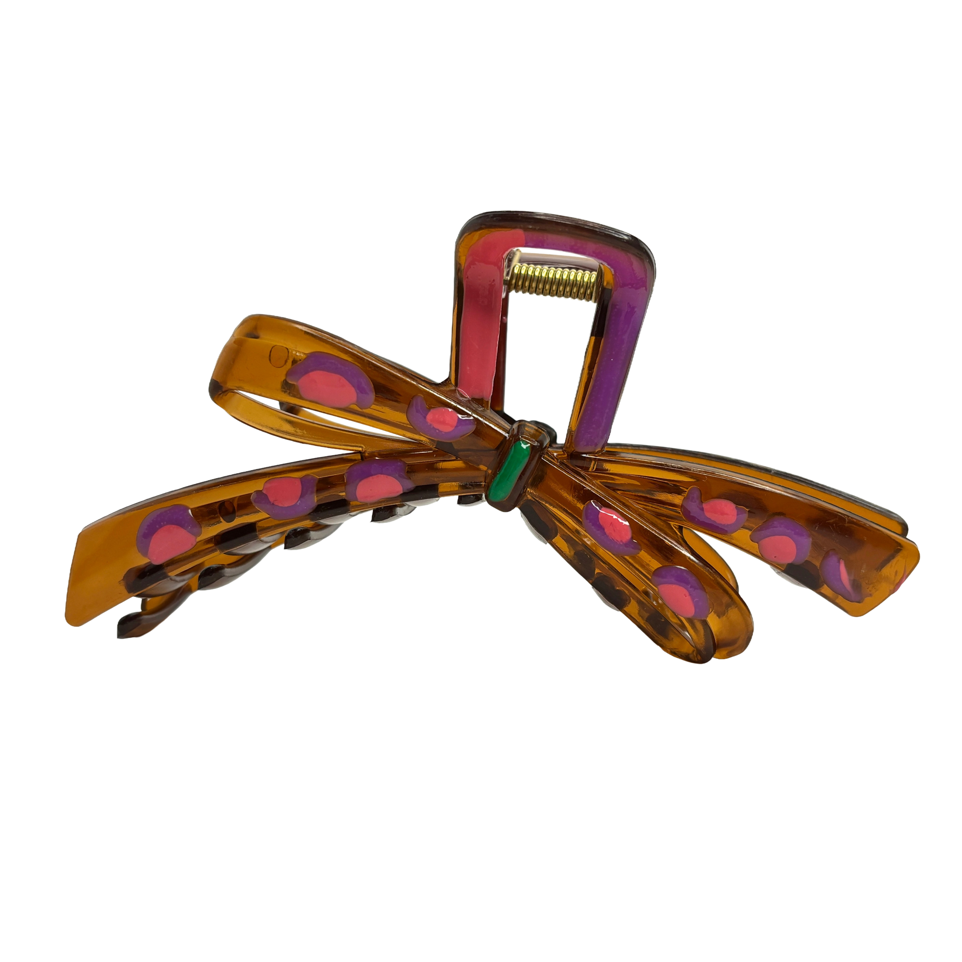Unik rosettformad estetik: Den skulpturala designen efterliknar en knuten rosett, vilket ger en tredimensionell effekt i ditt hår. Den transparenta bärnstenstonen skapar ett vackert djup som framhäver de glada färgstänken i mönstret.