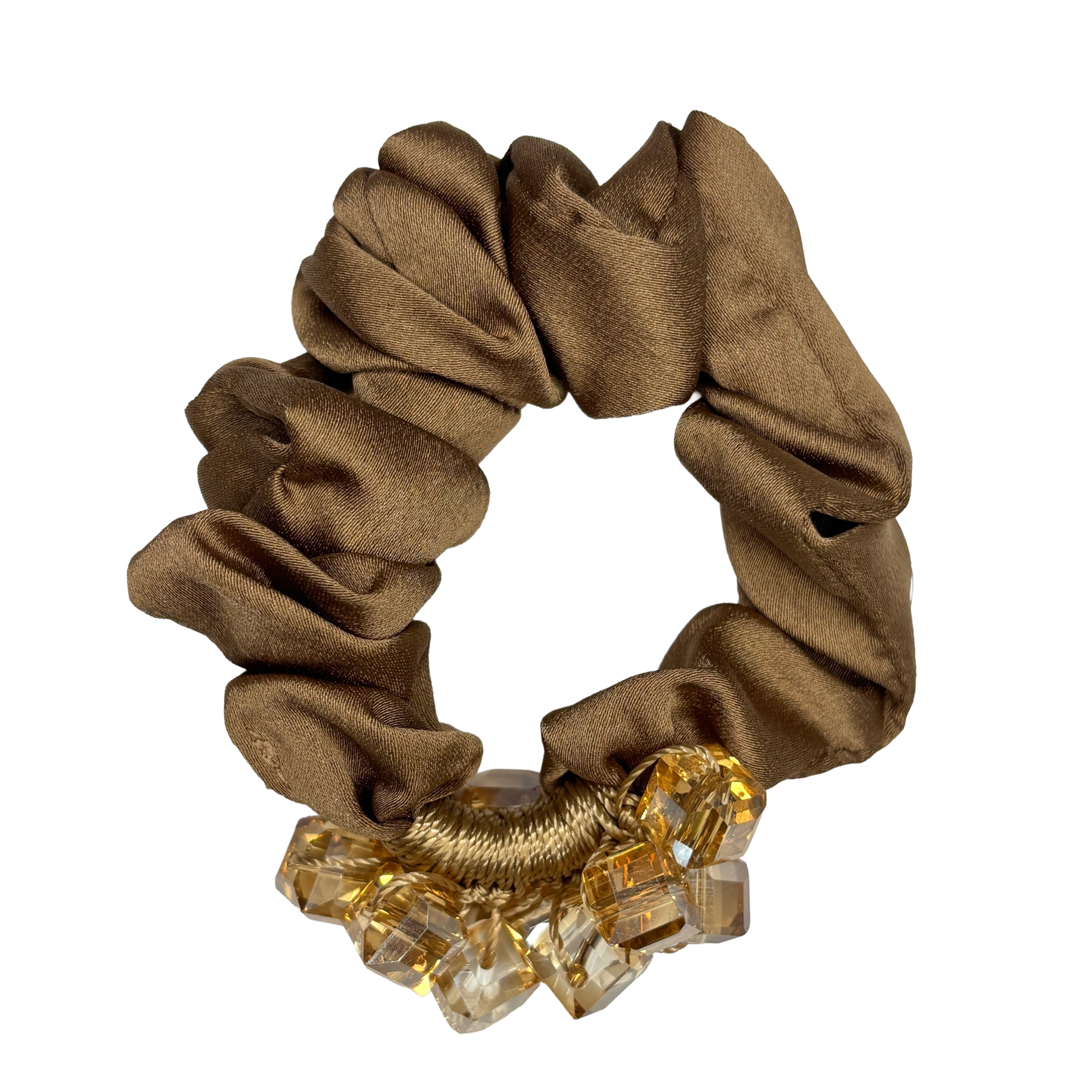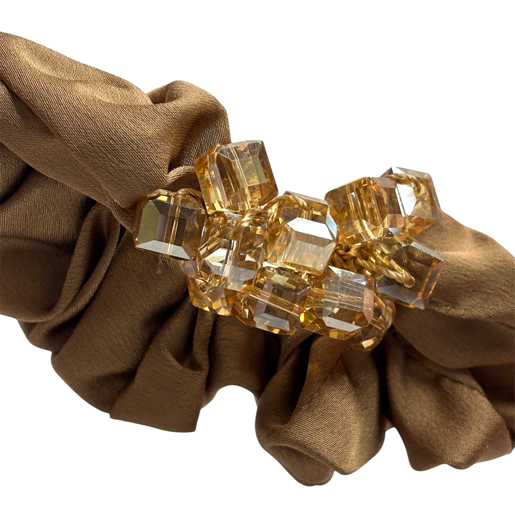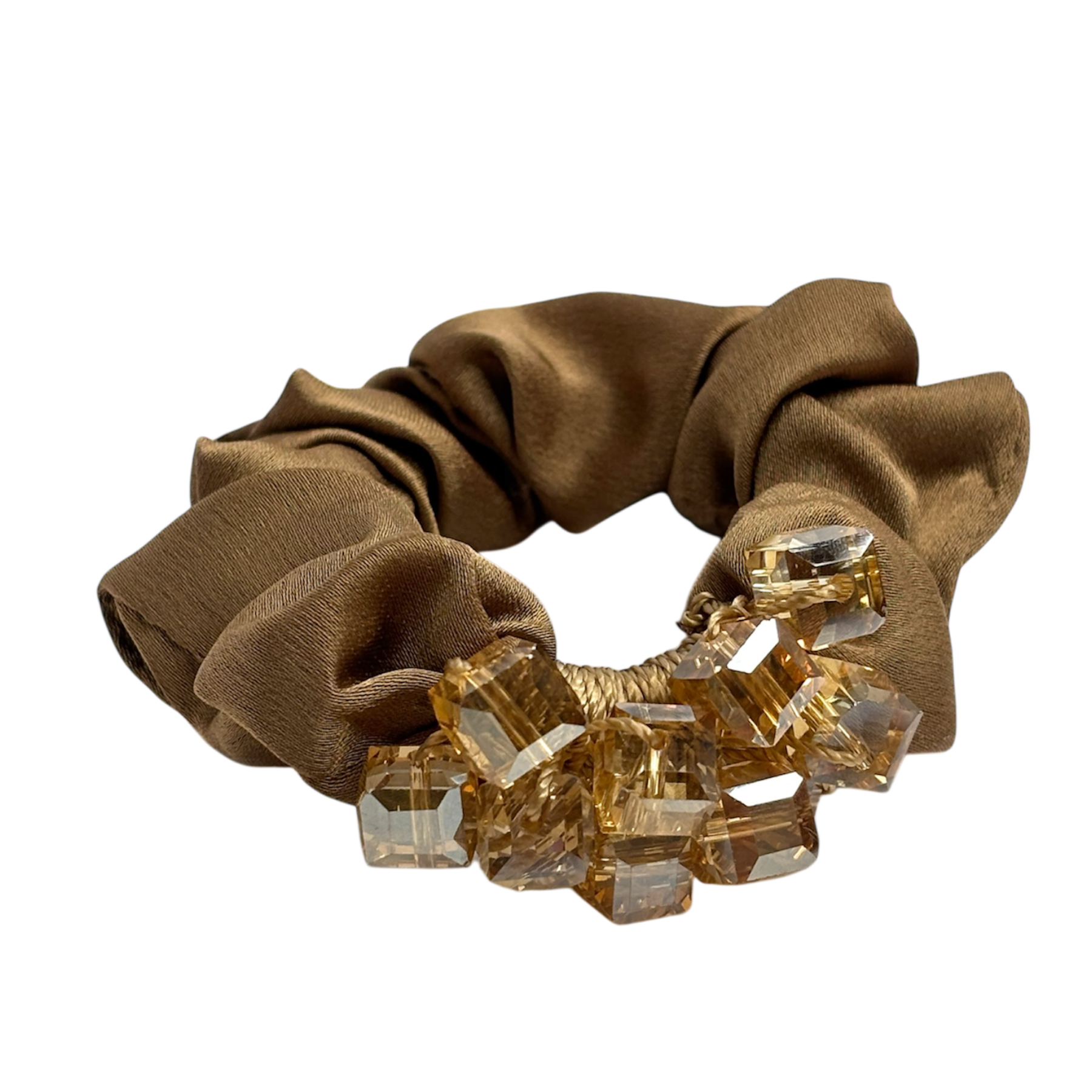 Ge din styling en varm och lyxig inramning med Bronze Champagne. Denna scrunchie förenar en ljus, skimrande bas i en champagne-bronsig nyans med ett kluster av stora, bärnstensfärgade glaskristaller. Det är en sofistikerad men kaxig accessoar som skapar ett perfekt djup och ger en exklusiv lyster till varje frisyr.