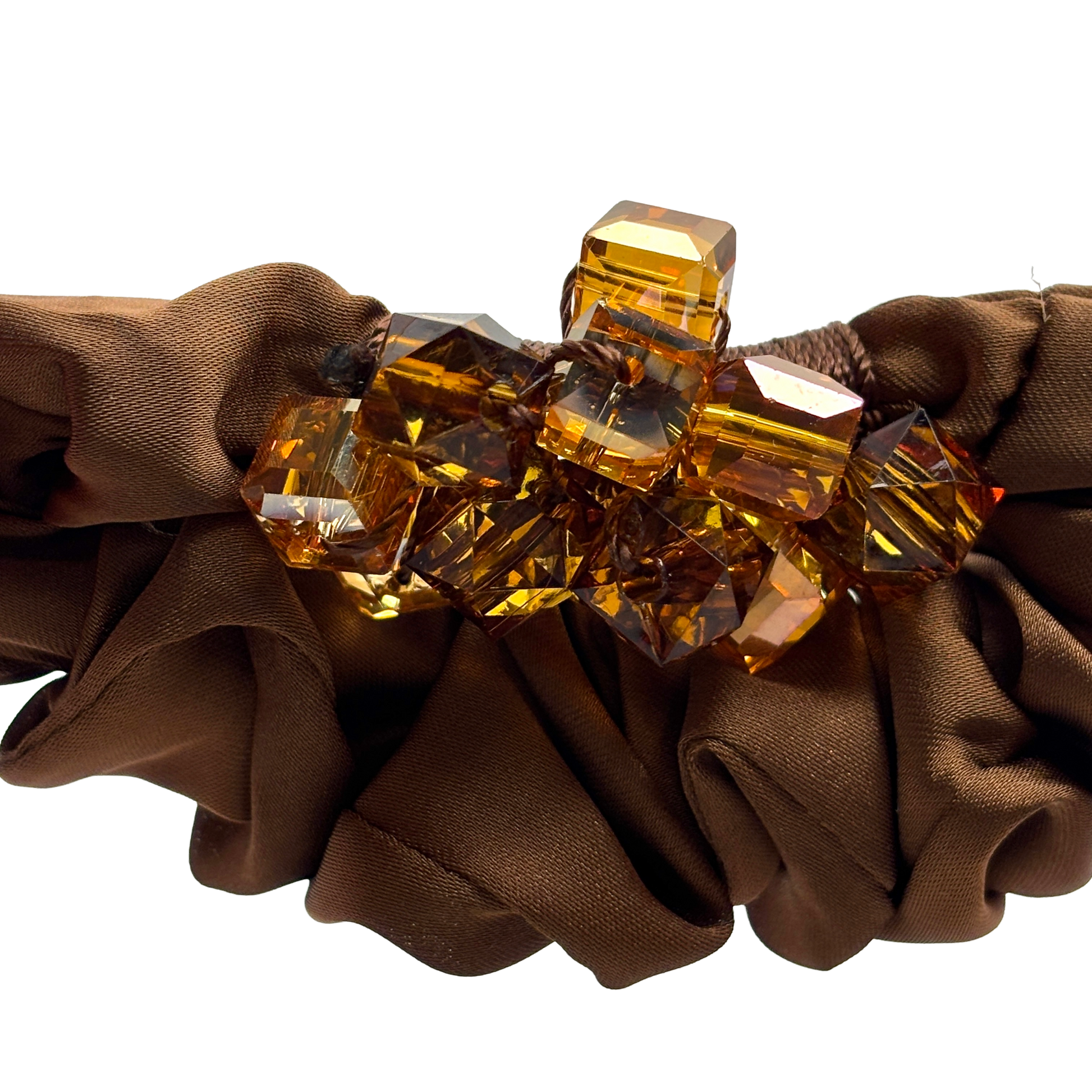 Kristaller med rödbrun lyster: De bärnstensfärgade glaskristallerna har en unik ton med inslag av rött och är omsorgsfullt fastsydd med slitstark bomullstråd för att sitta stadigt på plats.