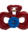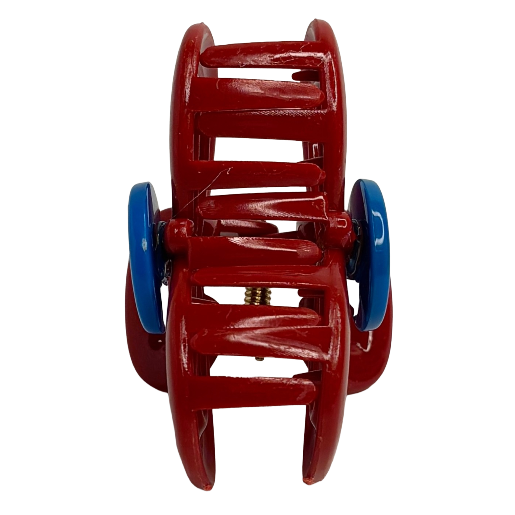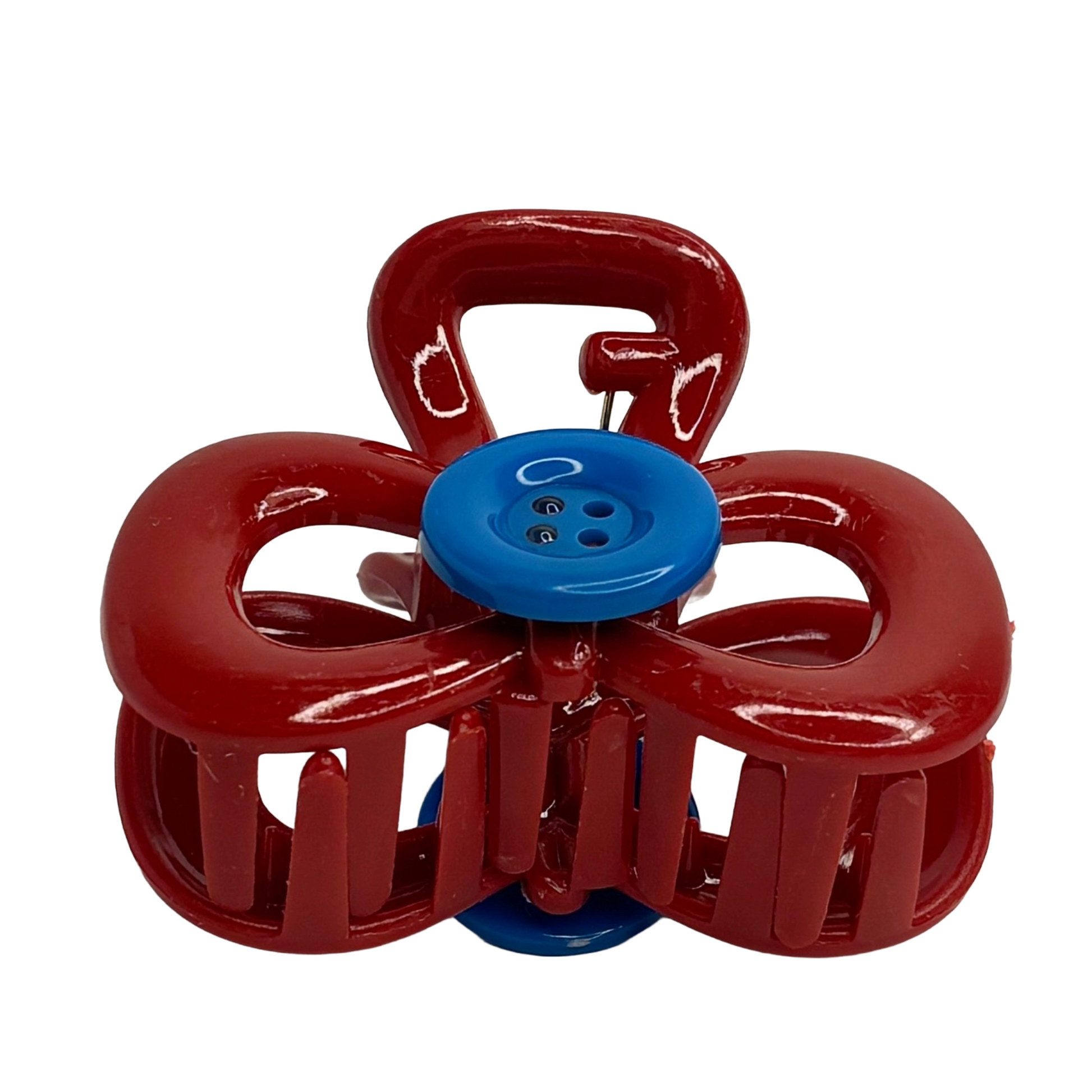 Unik retroestetik: Den djupt röda basen och den knallblå knappdetaljen skapar en stilren men lekfull färgkombination. Det är ett handplockat smycke för håret som känns både vintage och modernt på samma gång.