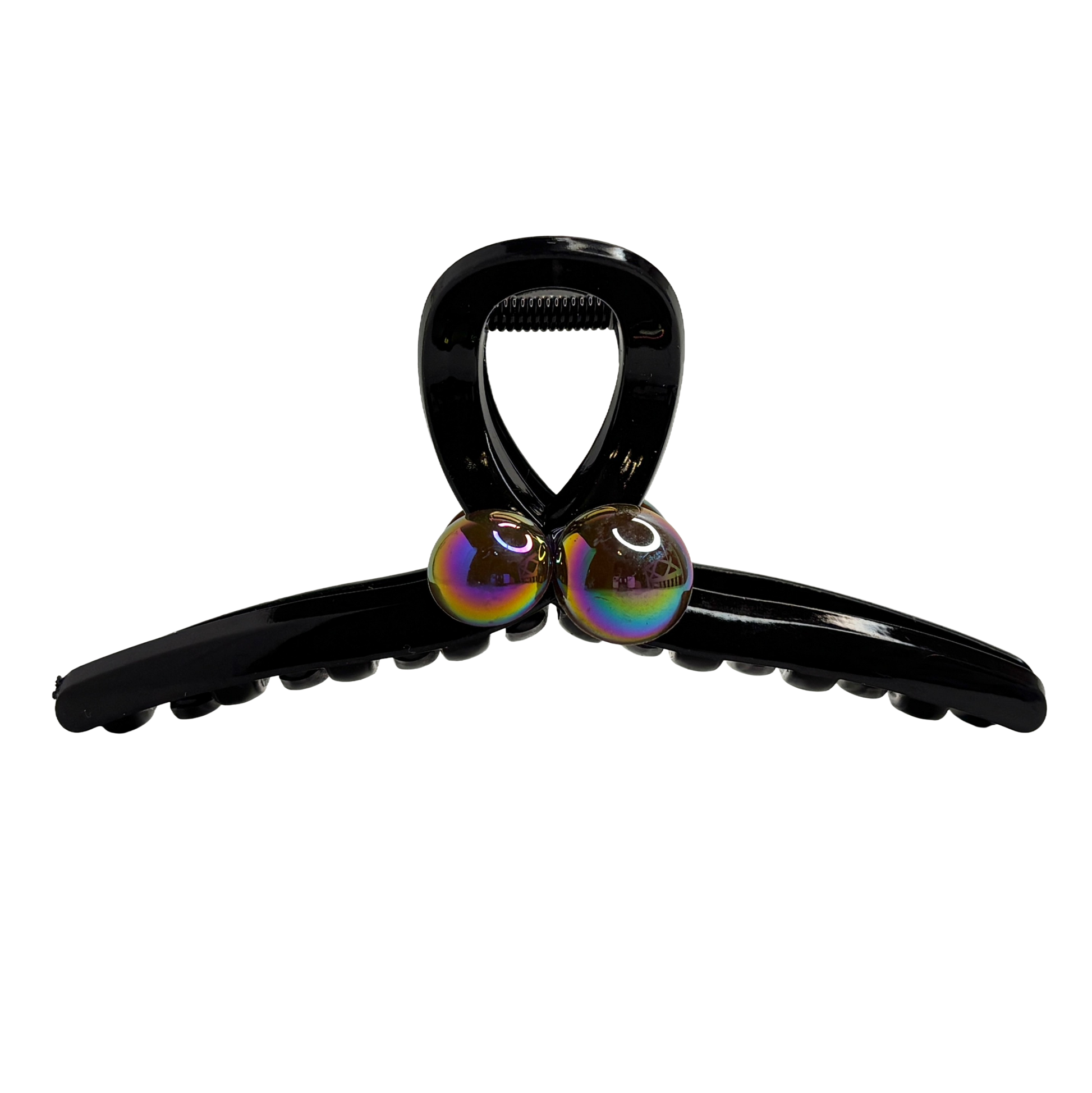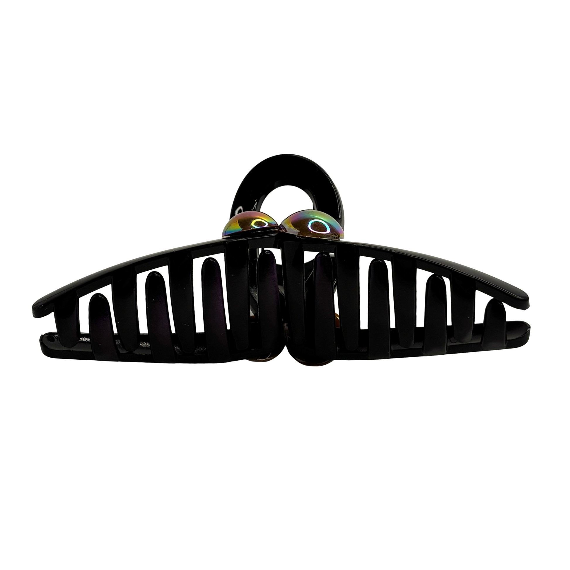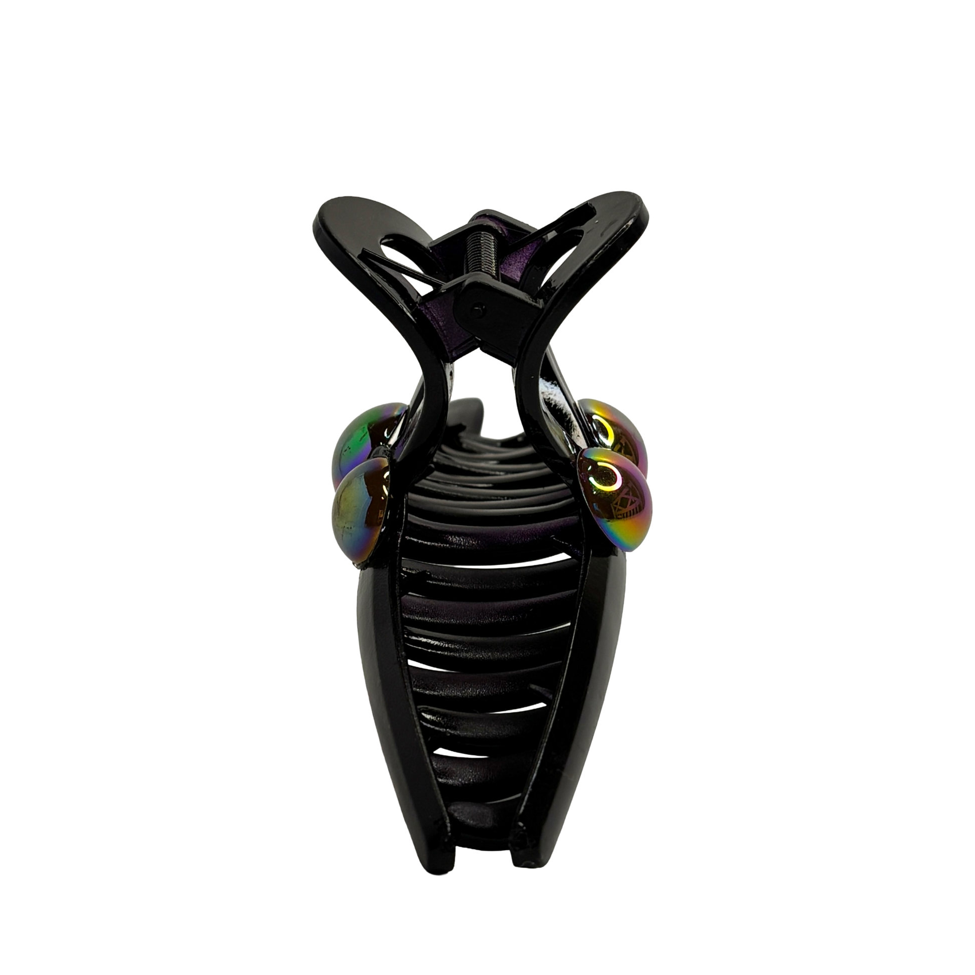 Ge din styling en futuristisk och fängslande inramning med Cosmic Oil. Denna unika hårklämma kombinerar en solid svart bas med ett spektakulärt regnbågsskimmer som vilar på sidorna. Det oljeskimrande mönstret skiftar i blått, grönt och lila beroende på hur ljuset faller, vilket ger en effekt som påminner om bensin på vatten eller en stjärnklar galax. Den geometriska formen skapar en modern silhuett som verkligen låter det skimrande färgspelet ta plats och bli ett blickfång i din frisyr.