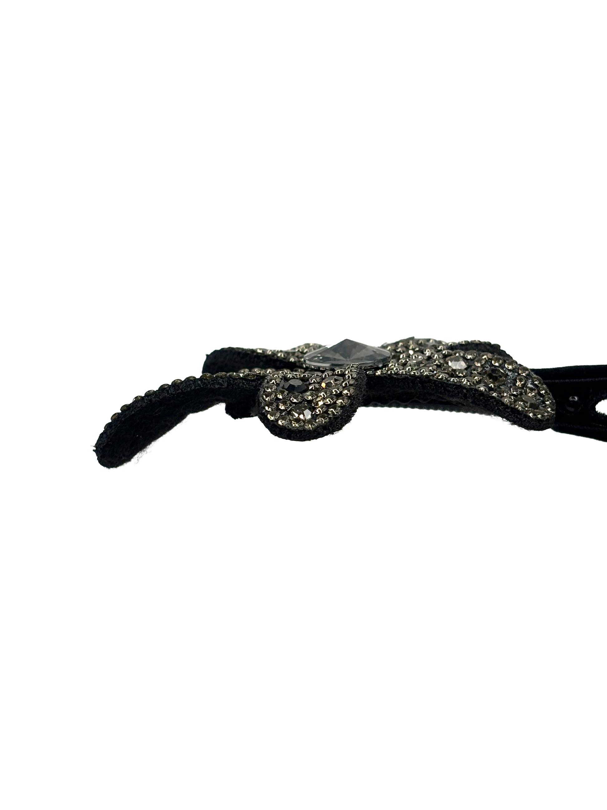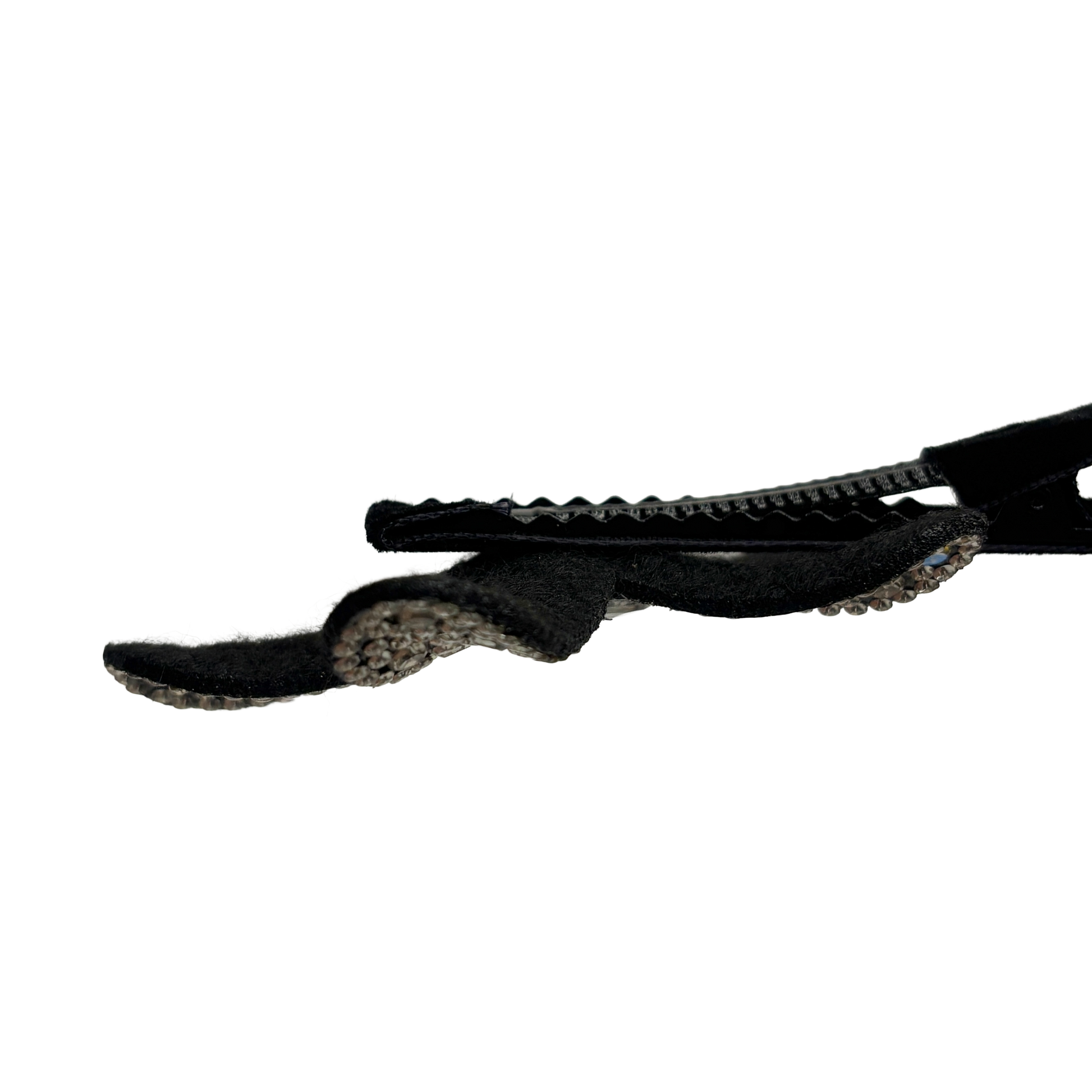 Addera en touch av vintage-lyx till din vardagslook med Crystal Bloom. Denna handarbetade lilla hårklämma är elegant klädd i mjuk svart velour som döljer metallbasen och ger en sofistikerad kontrast till de gnistrande stenarna. Den vackra blomman är prydd med fasetterade stenar som fångar ljuset och fungerar som ett perfekt litet smycke för ditt hår.