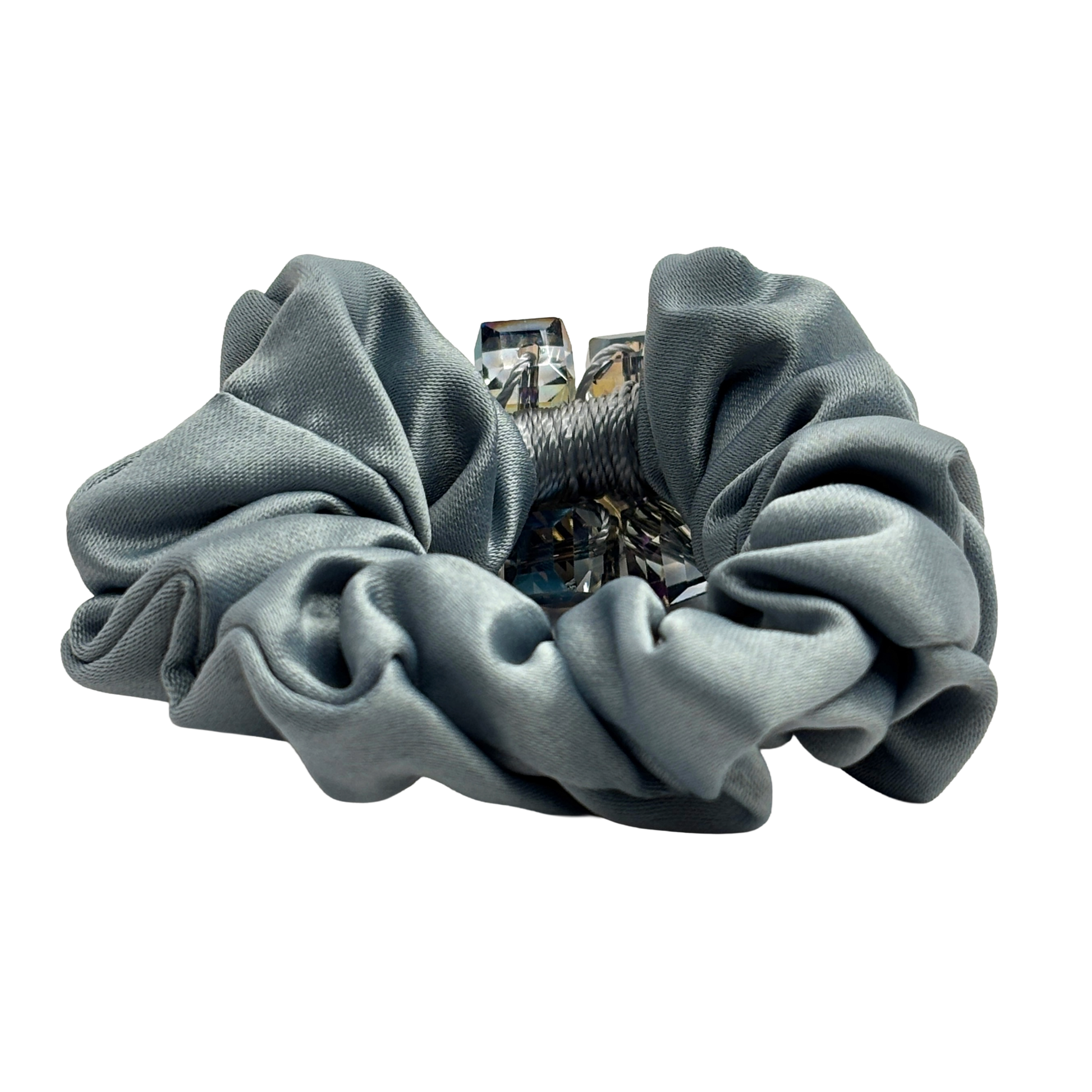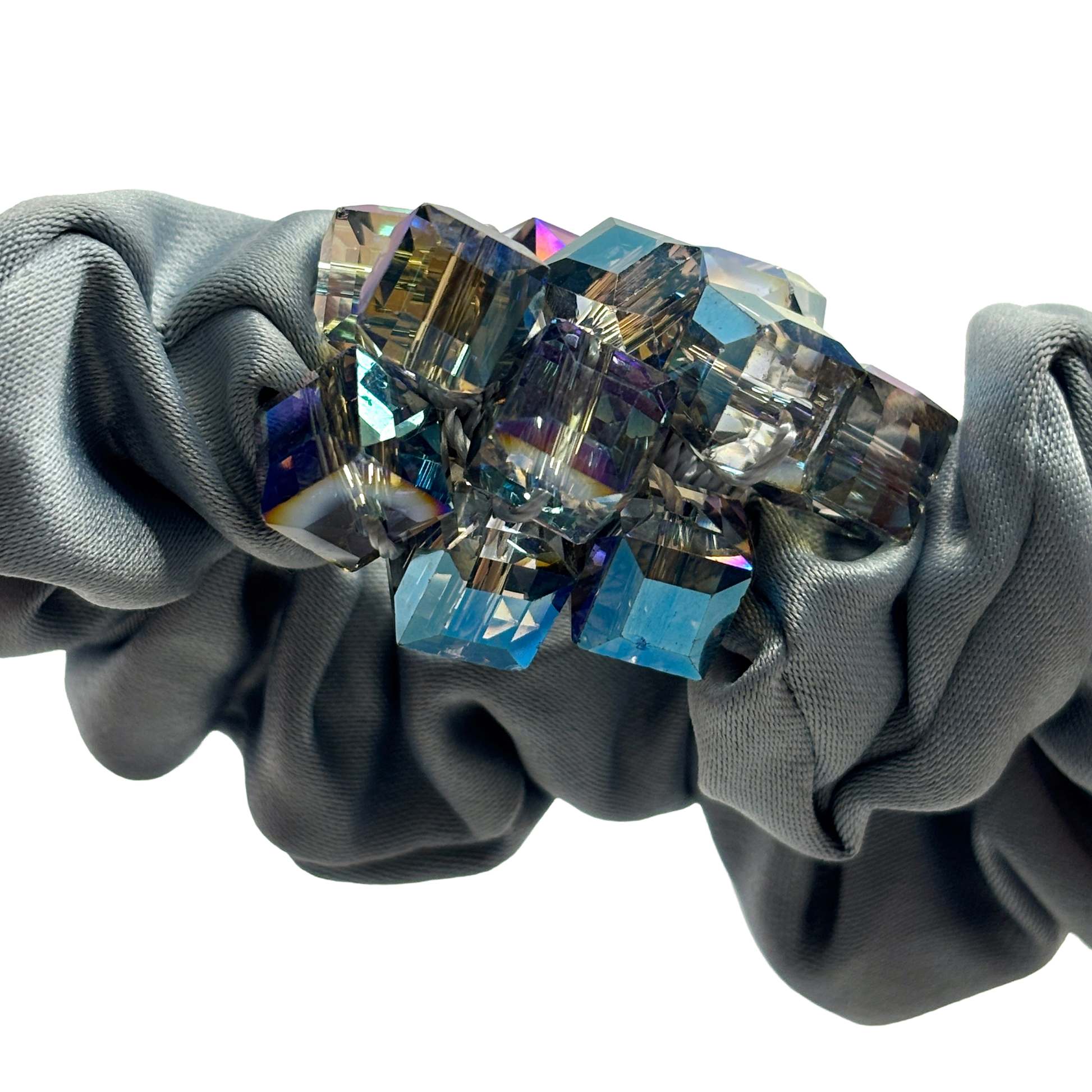 Ge din styling en touch av dämpad elegans med Dusty Sapphire, en accessoar som suddar ut gränsen mellan hårsnodd och smycke. Denna unika skapelse kombinerar en bas i en sofistikerad smutsblå och blågrå textil med ett maffigt kluster av gnistrande prismor. Den dova, vackra tonen i tyget framhäver glaskristallernas skiftningar och skapar en lyxig detalj som lyfter vilken frisyr som helst.