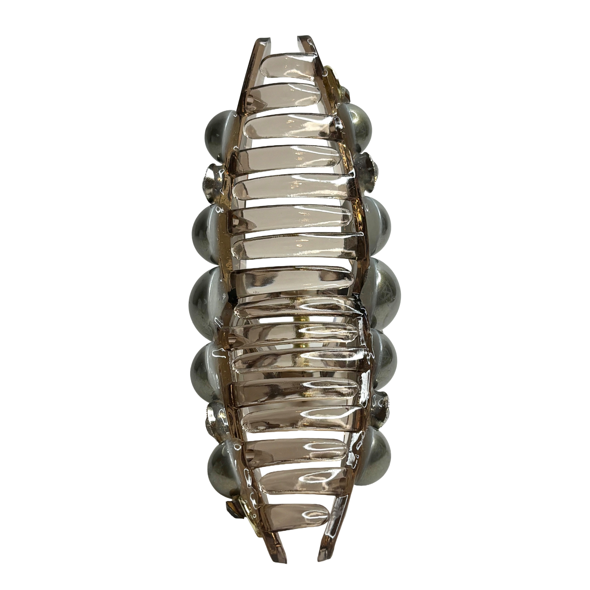 Cinematisk lyster: Den rökiga basen fungerar som ett filter som ger kristallerna ett dovare och mer exklusivt sken. Tillsammans med de koordinerade grå pärlorna skapas en monokrom och visuell effekt som känns både tidlös och framåtriktad.