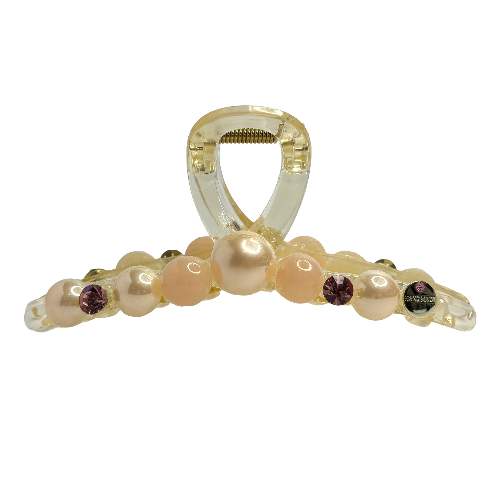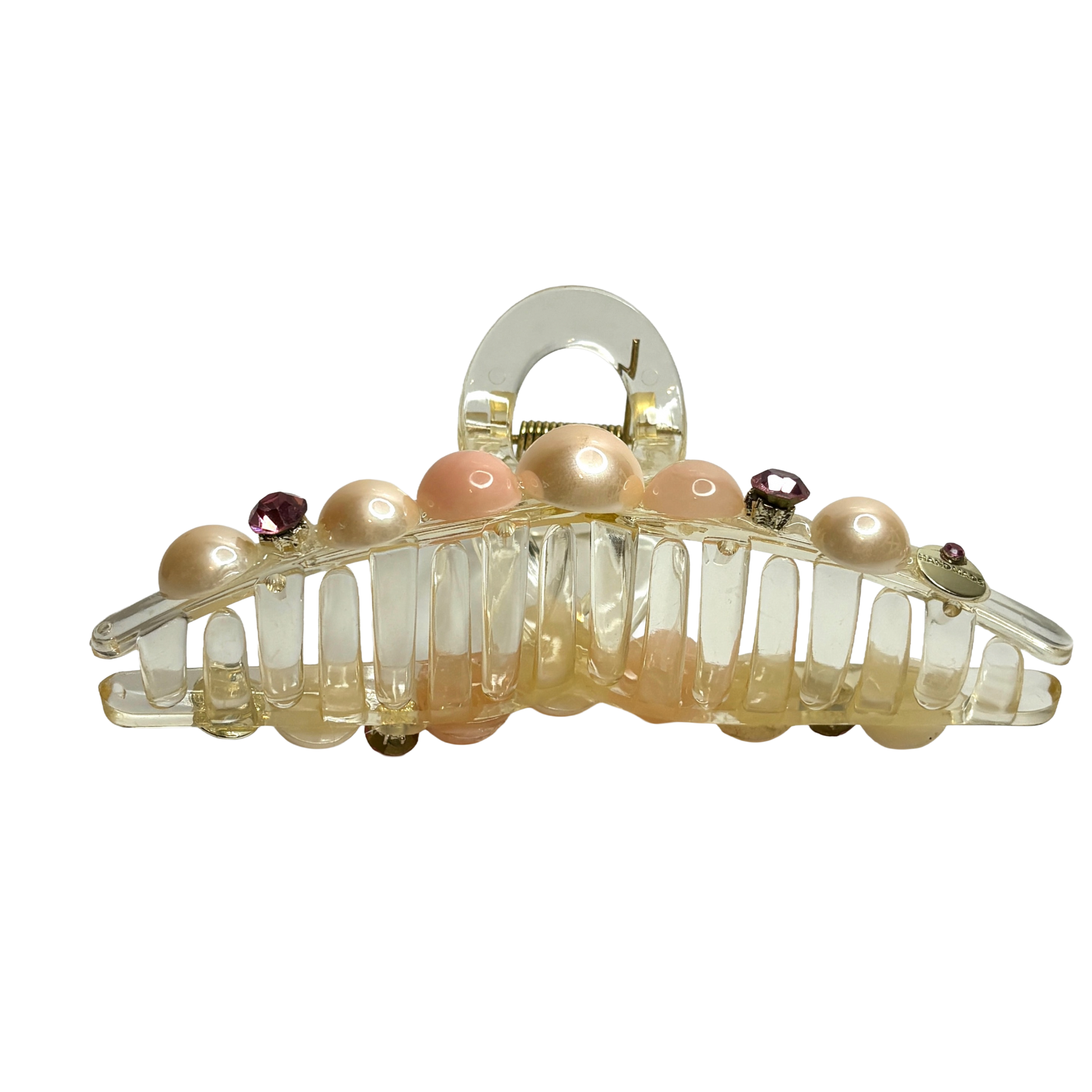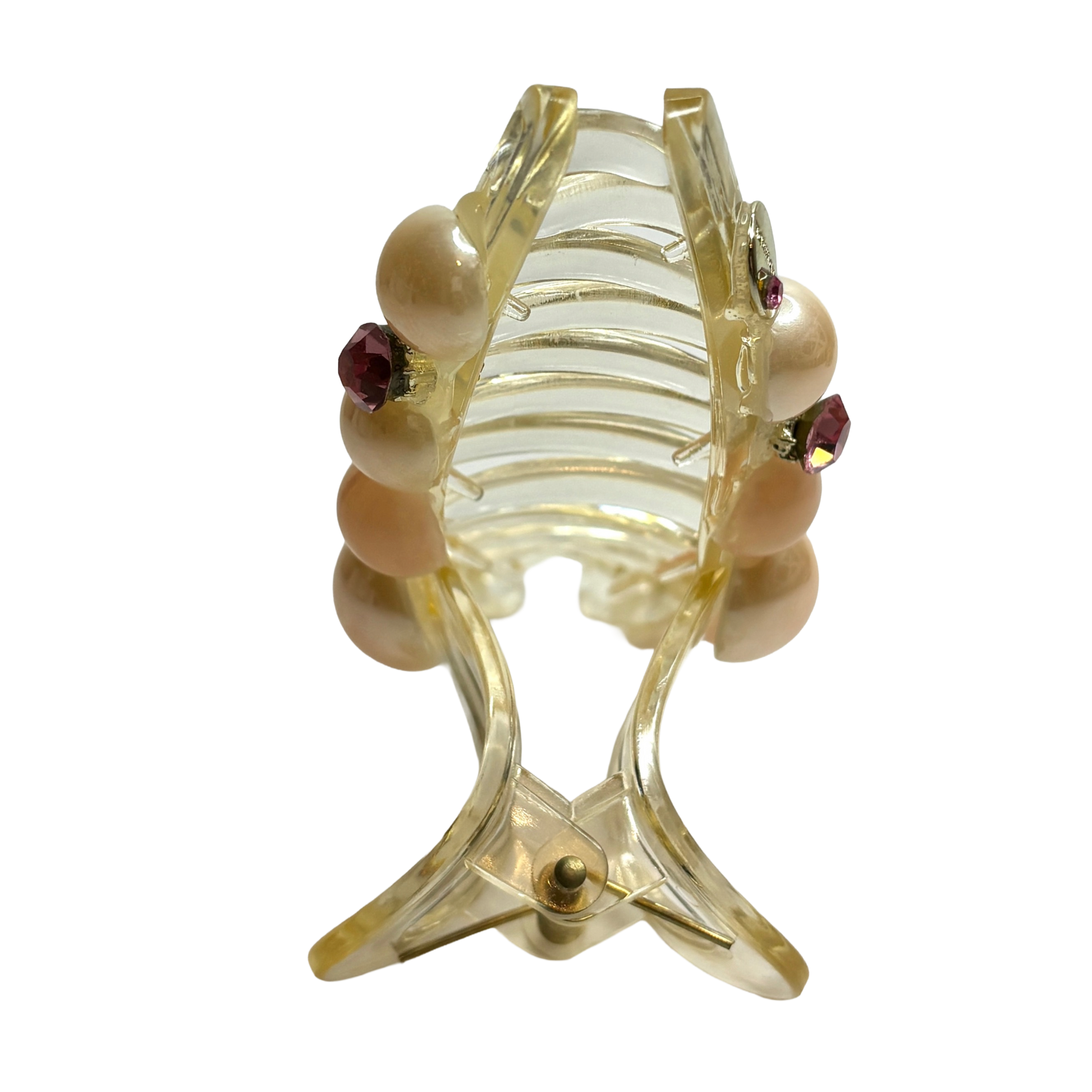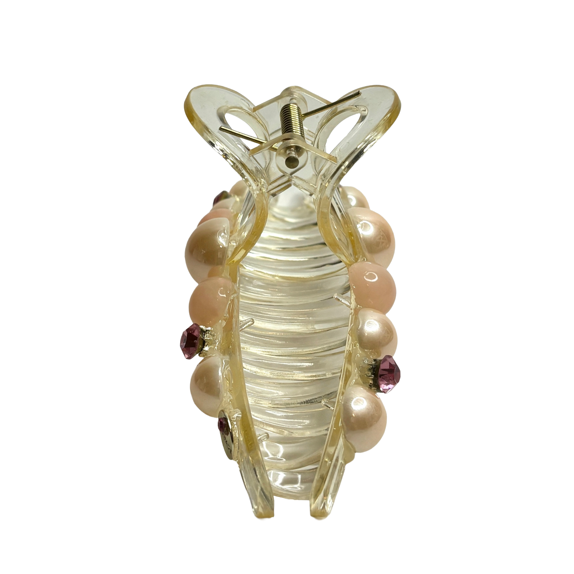 Låt din stil lysa upp vardagen. Pink Morganite är hårklämman som förkroppsligar en mjuk och feminin kraft. Med sin kristallklara bas prydd av handplacerade pärlor i mjuka persikotoner och gnistrande rosa kristaller, är den skapad för att ge din frisyr en romantisk och lyxig finish på bara några sekunder.