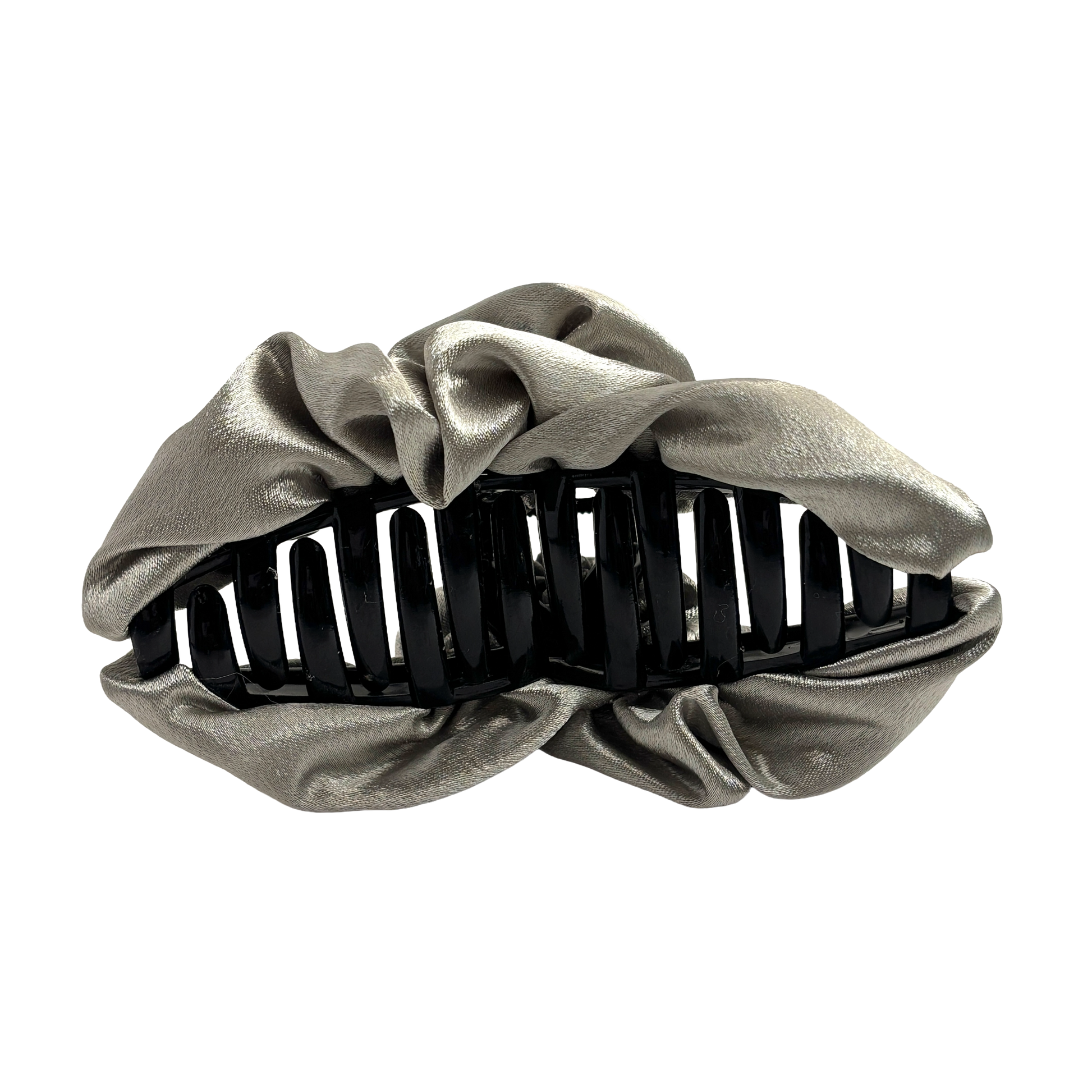 Innovativ textil-fusion: Denna smarta design döljer en robust klämma under flödande satin, vilket ger dig en fyllig och trendig styling på ett ögonblick.