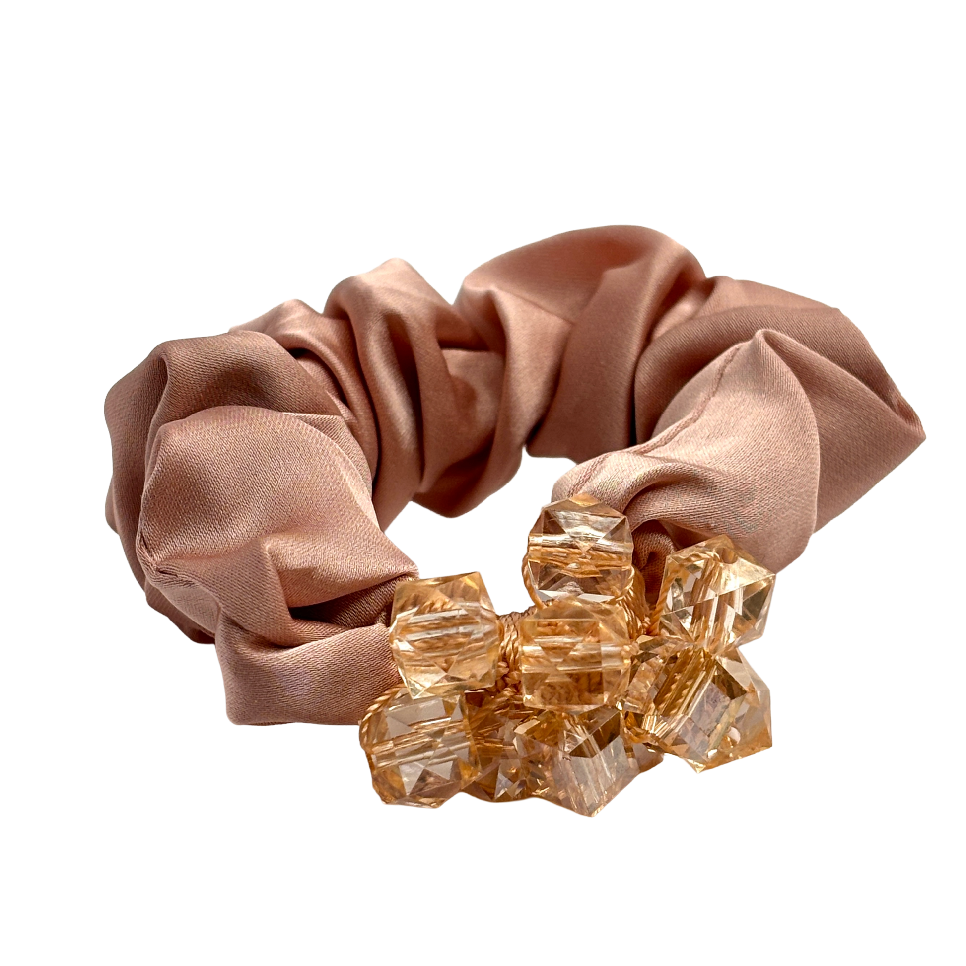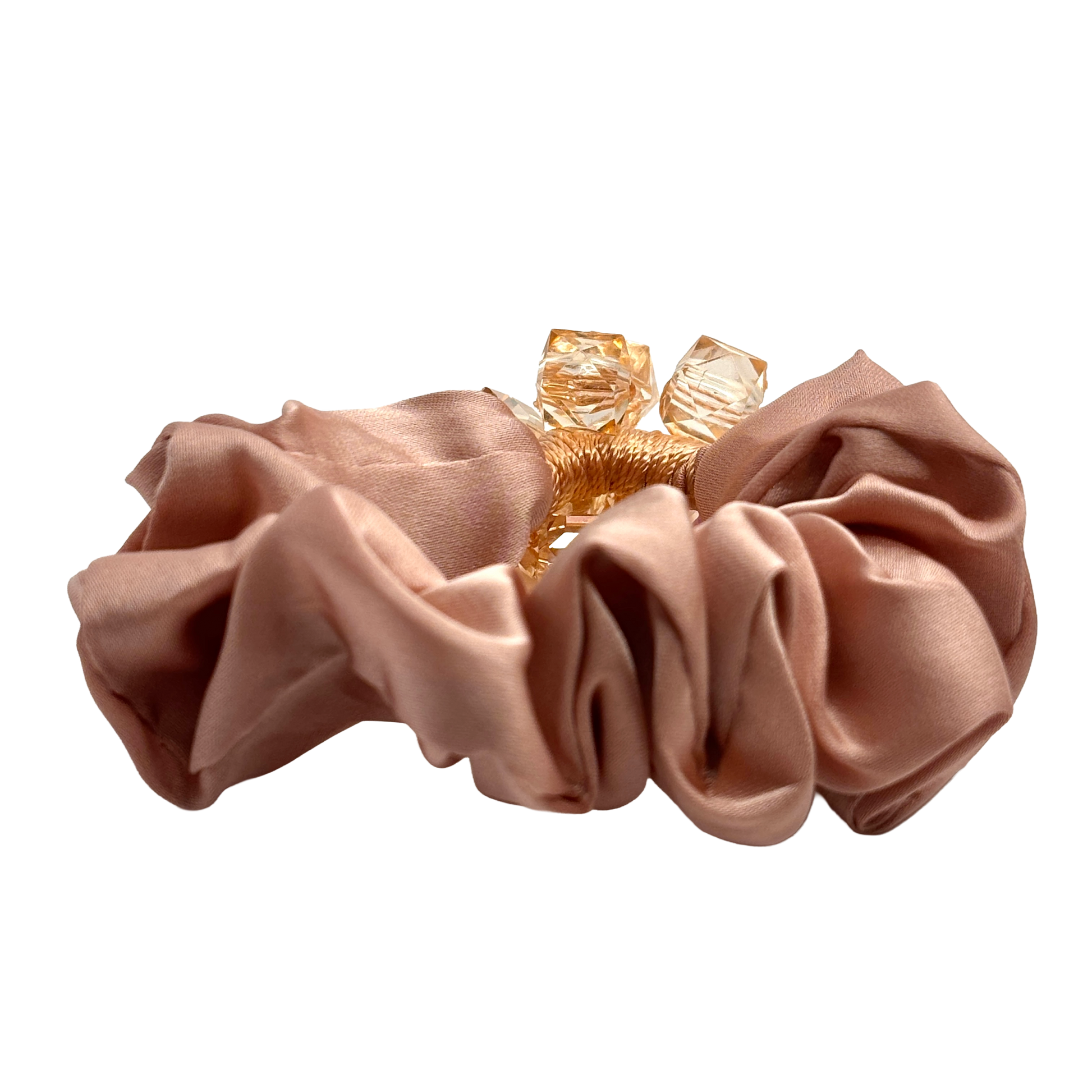 Ge din stil en varm och gnistrande uppgradering med Vintage Rosé. Denna scrunchie strålar av lyx där en mjuk bas i puderrosa möter ett kluster av bärnstensfärgade glaskristaller som fångar ljuset på ett helt magiskt sätt. Det är en sofistikerad accessoar som kombinerar ljusa, feminina toner med en kaxig briljans som garanterat lyfter varje outfit.